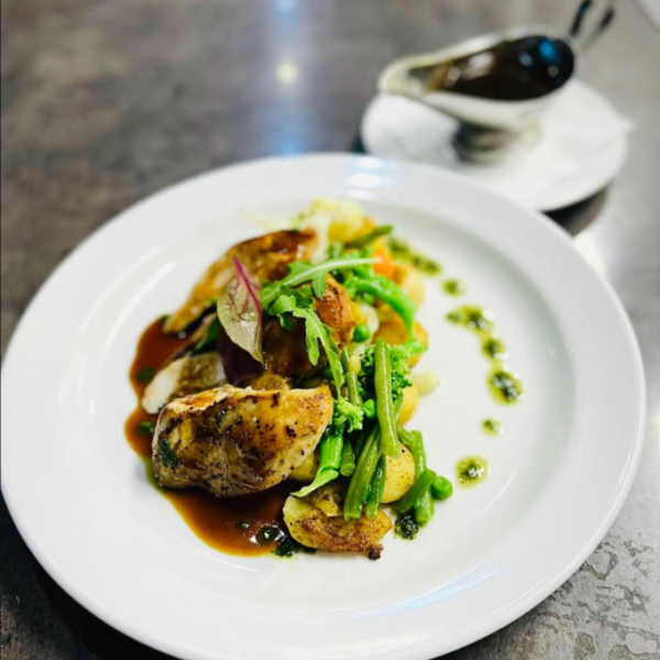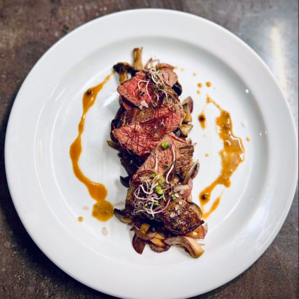11.20€S demi-glace omáčkou, pečenými zemiakmi a blanžírovanou zeleninou (200g)