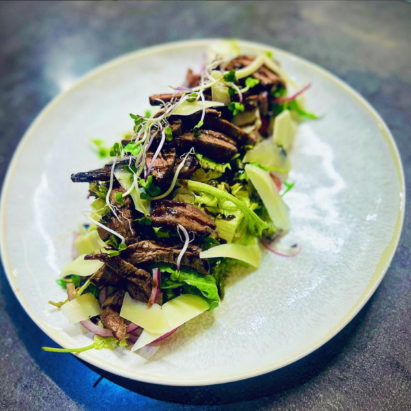 11.90€Grilovaný krájaný flank steak (150g), rukola, cherry paradajky, karamelizovaná cibuľa, balzamiko, parmezán (300g)